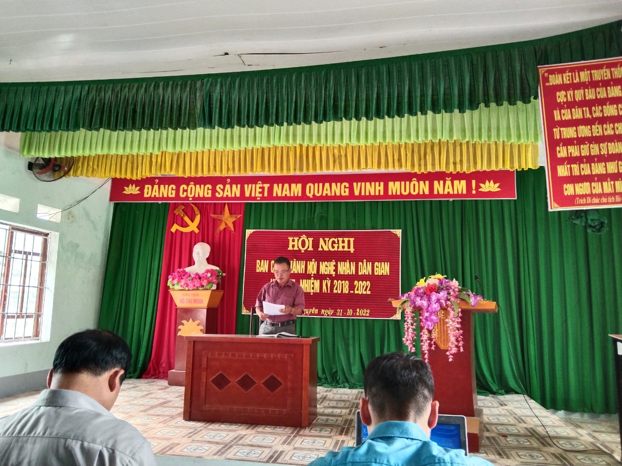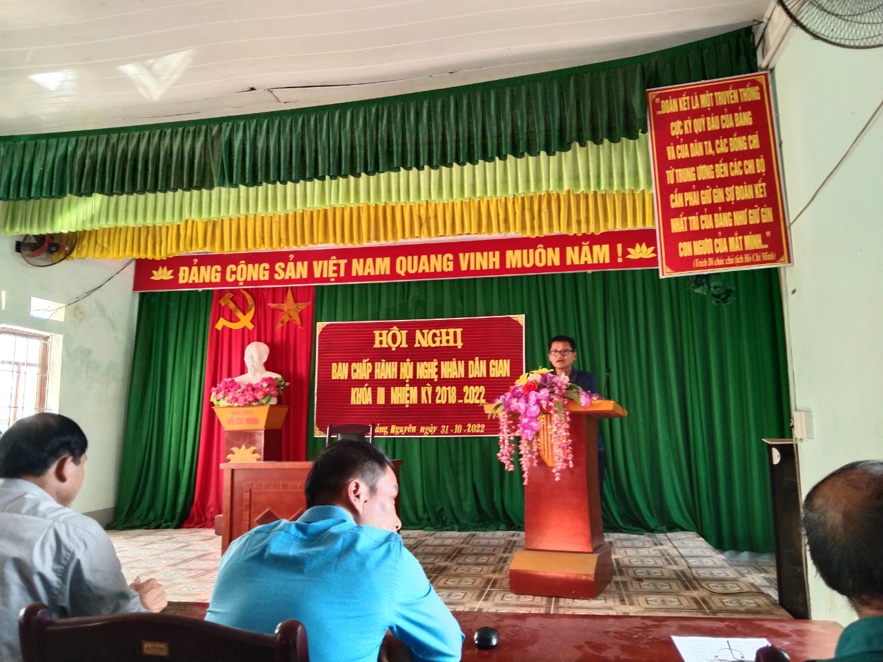 Hội nghị nhằm đánh giá kết quả đạt được trong thời gian qua và triển khai nhiệm vụ trong thời gian tới. Dự hội nghị có các đồng chí ủy viên Ban chấp hành hội nghệ nhân dân gian; về phía lãnh đạo xã có đòng chí Đặng Văn Tắc, phó chủ tịch UBND xã dự. Trong thời gian qua Hội nghệ nhân dân gian đã làm tốt công tác tuyên truyền phổ biến giáo dục pháp luật đến toàn thể bà con nhân dân; thường xuyên giám sát, đôn đốc nhân dân thực hiện tốt chính sách của Đảng, pháp luật của Nhà nước./.