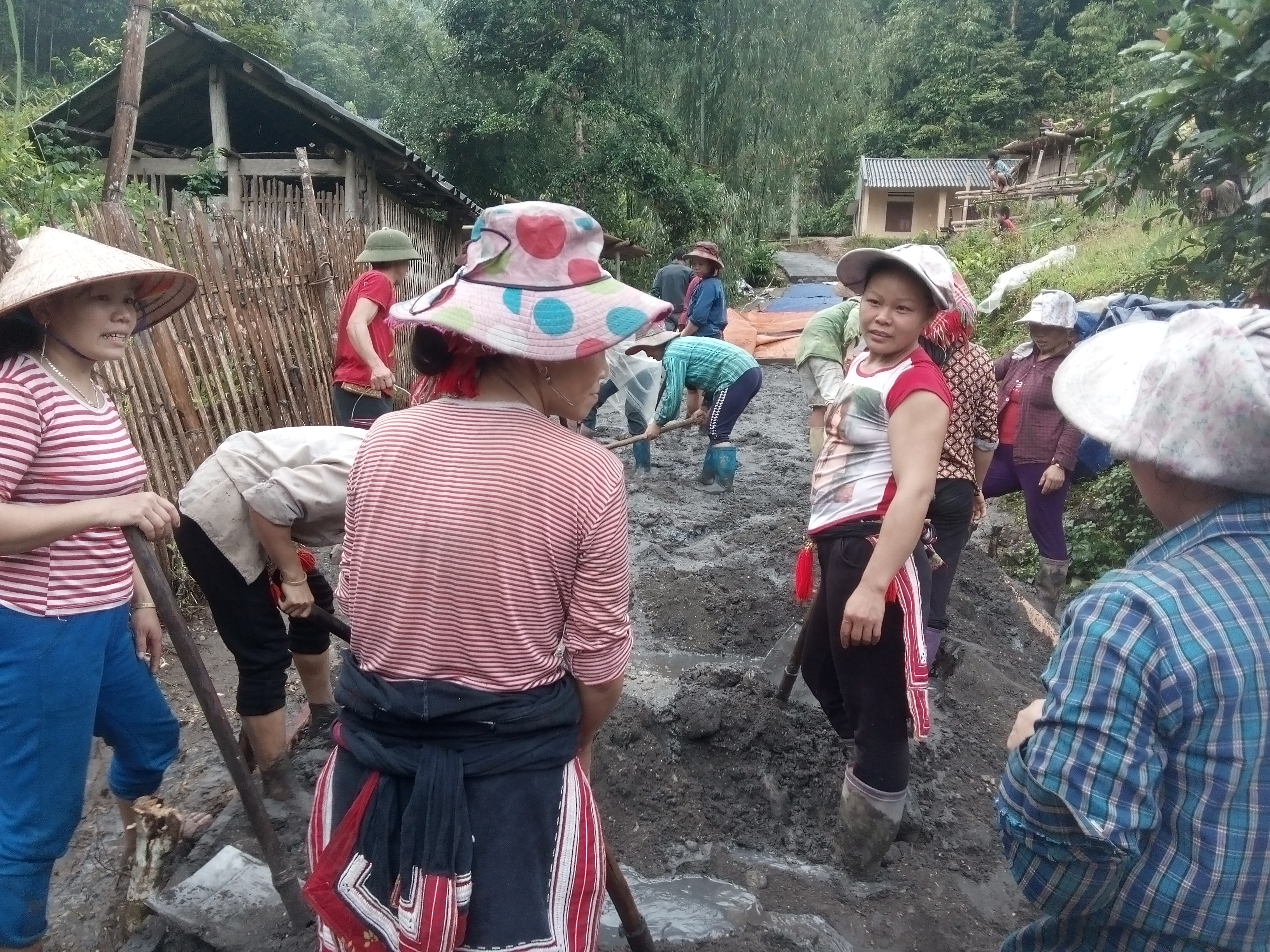 Ảnh: Nhân dân thôn Vinh Tiến đang thi công tuyến đường từ trụ sở thôn ra trung tâm xã.