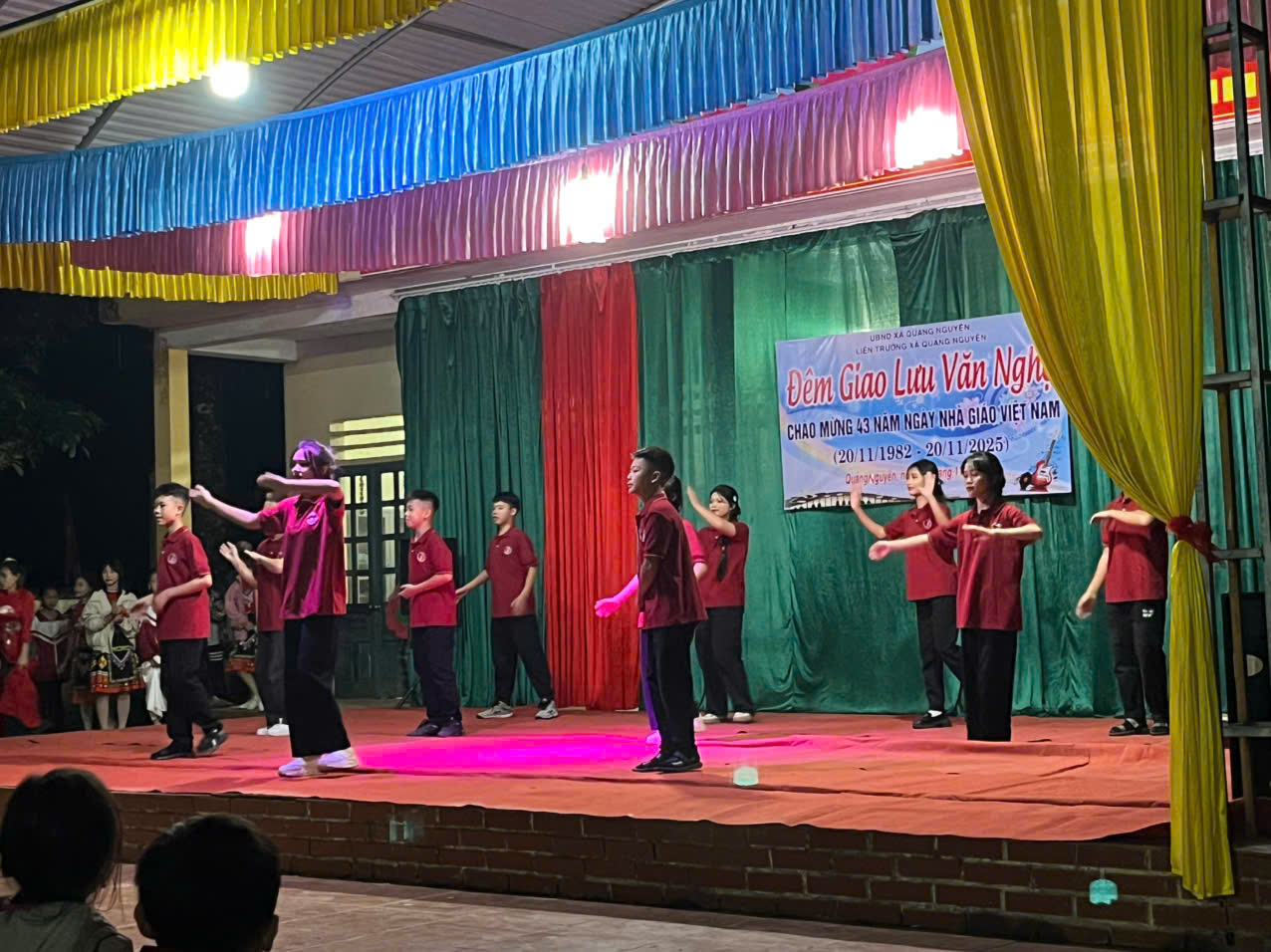 Trước đó, vào tối ngày 19/11/2025 đã diễn ra Đêm giao lưu văn nghệ chào mừng 43 năm ngày nhà giáo Việt Nam, với các tiết mục văn nghệ của các khối lớp và các thầy cô giáo đây là dịp để học sinh thể hiện lòng biết ơn sâu sắc đối với các thầy cô giáo, những người đã tận tâm dạy dỗ và dìu dắt mình. Qua các tiết mục, học sinh không chỉ thể hiện sự kính trọng mà còn khẳng định vai trò quan trọng của giáo dục trong sự phát triển của đất nước. Những bài hát, điệu múa hay các hoạt động văn nghệ không chỉ mang giá trị tinh thần mà còn là lời tri ân đối với sự cống hiến của các thầy cô trong sự nghiệp trồng người, góp phần làm cho ngày lễ trở nên trang trọng và đầy ý nghĩa.